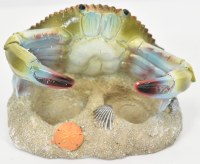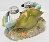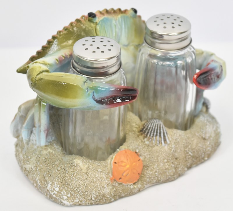 Crab-shaped salt and pepper holder with sandy base and seashell accents brings oceanside dining to your table. Includes both shakers for complete functionality.
