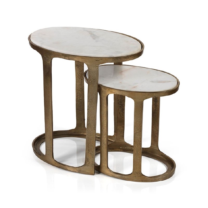Set of 2 Oval White Marble and Antique Gold Metal Nesting Tables