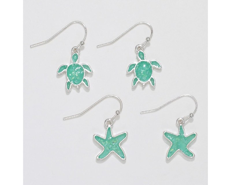 Set of Two Silver Toned and Aqua Sea Turtle and Starfish Earrings
