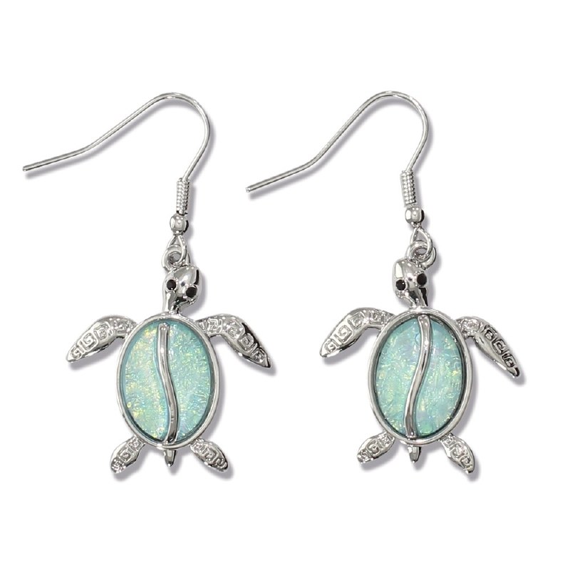 Silver Toned Turtle Earrings With an Aqua Polystone Inlay
