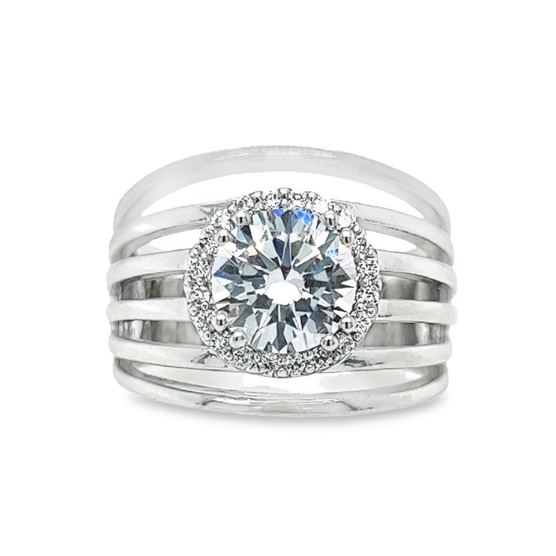 Size 6 Large Round Cubic Zirconia and Six Bars Sterling Silver Plated Ring