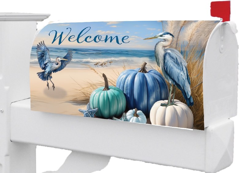 "Welcome" Blue Herons With Pumpkins on the Beach Coastal Fall & Thanksgiving Mailbox Cover
